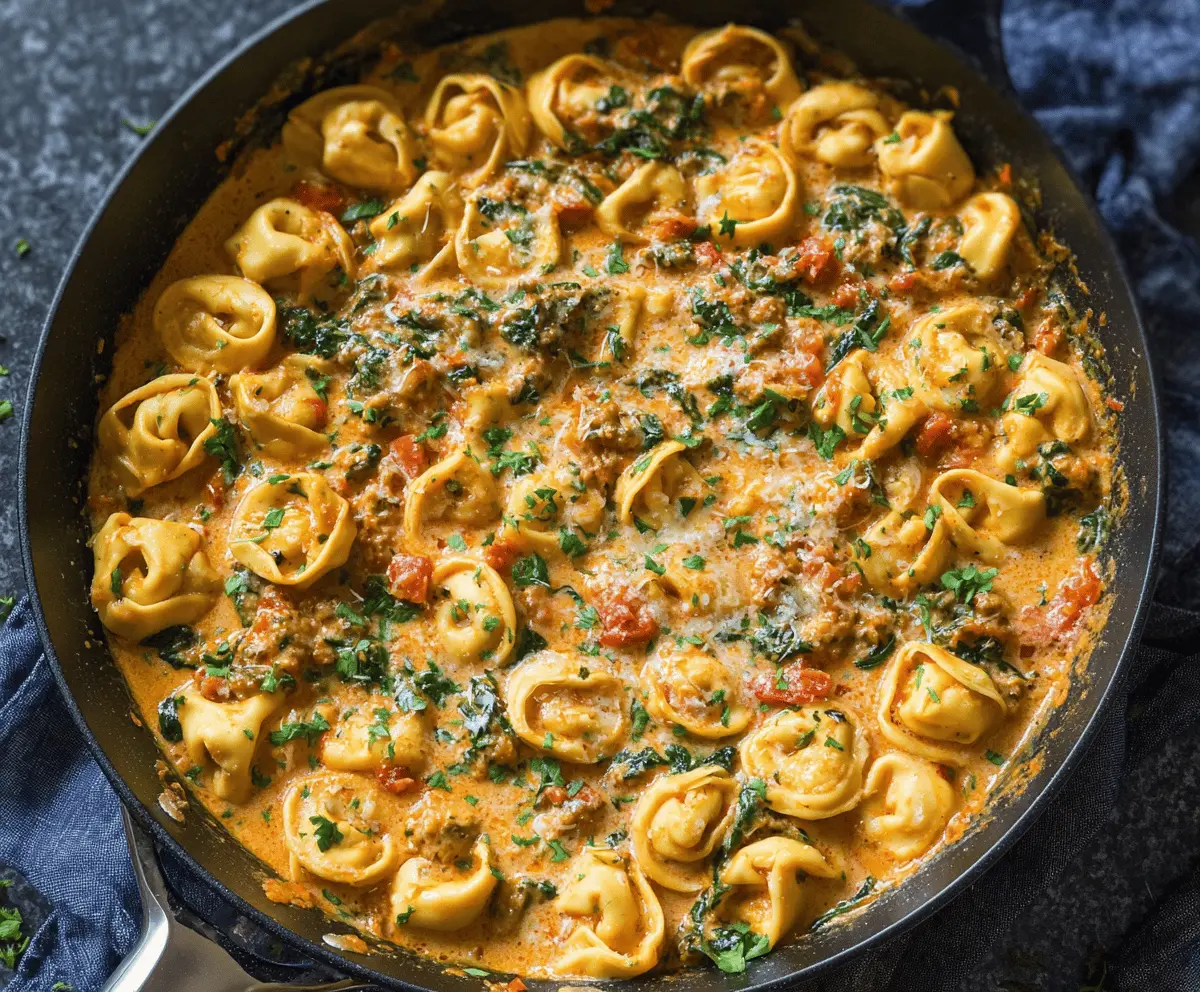 This recipe takes about 20 to 25 minutes from start to finish. You’ll spend around 10 minutes browning sausage and preparing ingredients, then about 10-15 minutes cooking the tortellini and combining everything into a creamy, flavorful sauce.